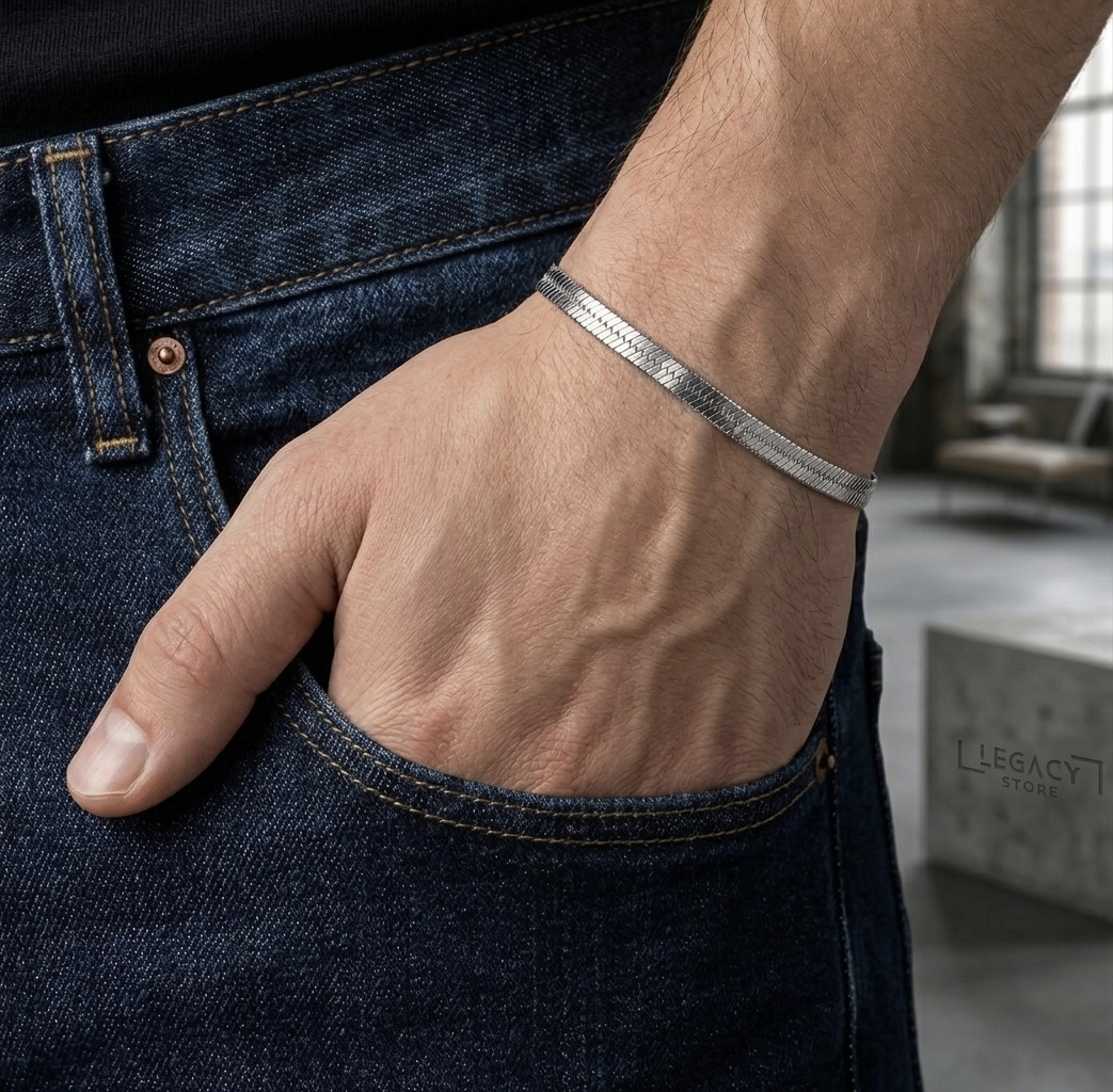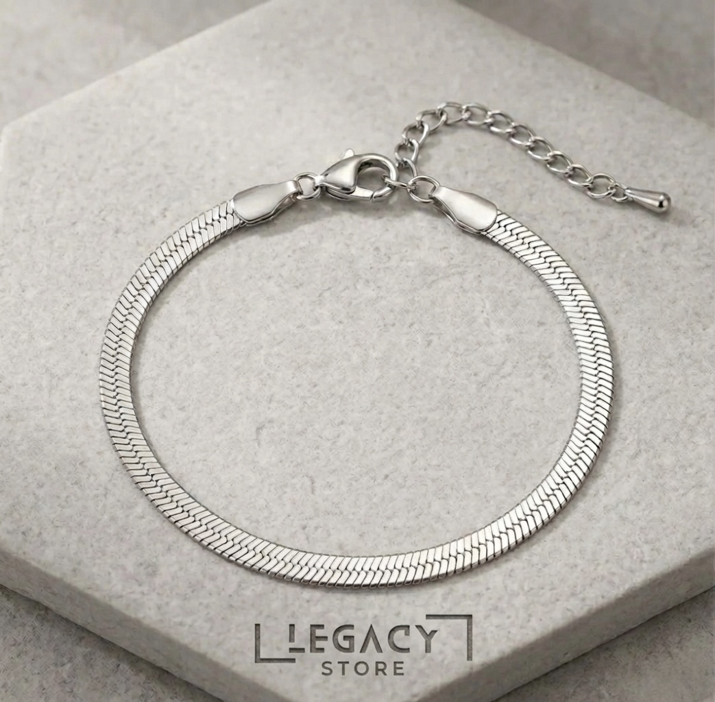 Affirmez une sophistication sobre avec le Bracelet Moon de LEGACY. Ce bracelet en maille serpent plate (Snake chain) se distingue par sa finition argentée polie à l’extrême, offrant un reflet fluide et métallique qui capte chaque rayon de lumière. C’est l’accessoire essentiel pour ceux qui recherchent un style épuré, moderne et indestructible.