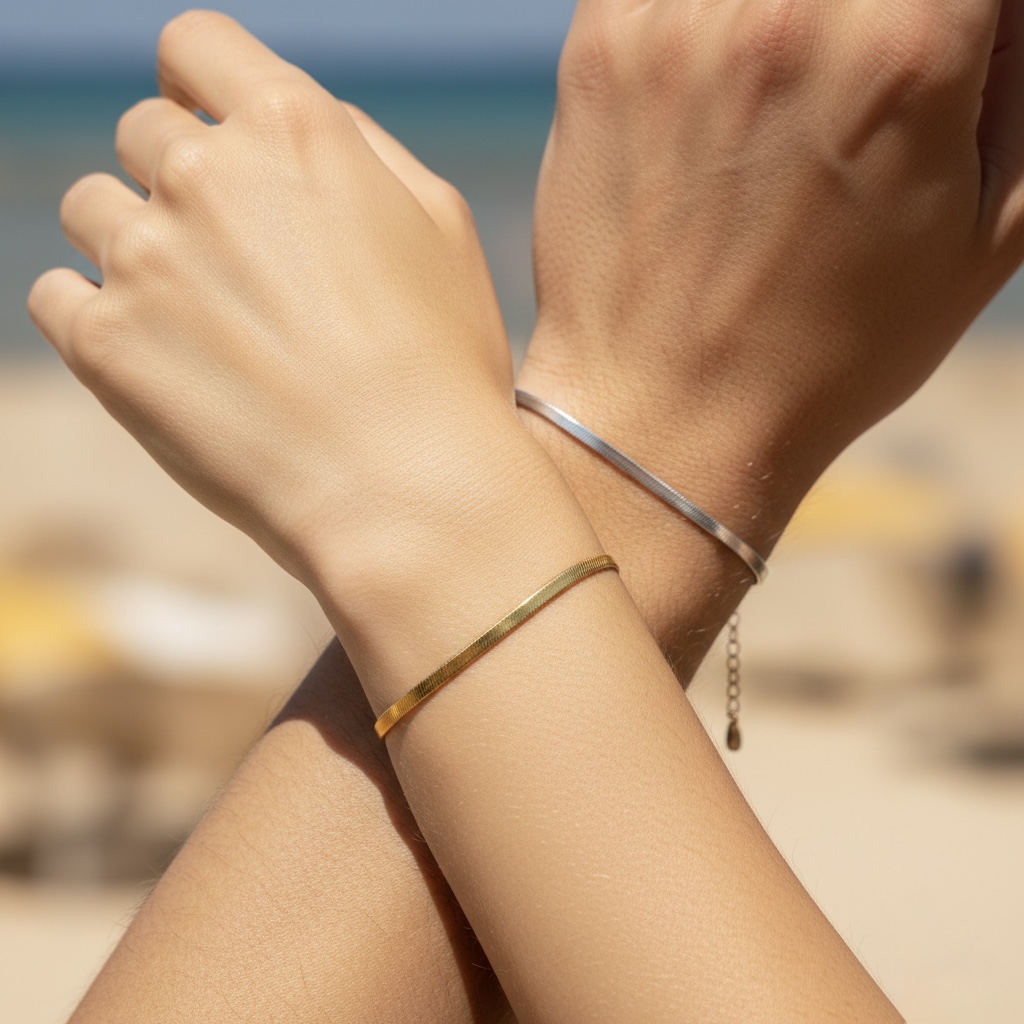 Le Duo Sun & Moon de chez LEGACY est bien plus qu’un ensemble de bijoux ; c’est une promesse de durabilité. Ce set comprend deux bracelets au design « Snake » (maille serpent) plate, offrant un reflet fluide qui capte la lumière à chaque mouvement. L’un en finition Or éclatant (Sun) et l’autre en Argent pur (Moon), pour un contraste parfait.
